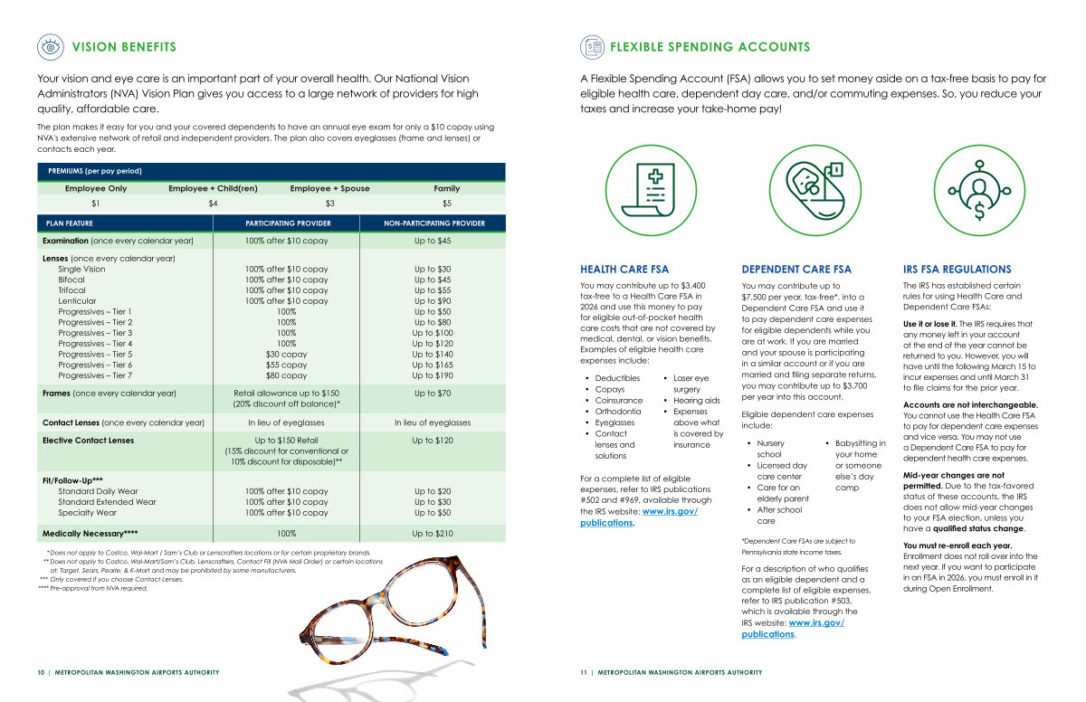 The plan makes it easy for you and your covered dependents to have an annual eye exam for only a $ 10 copay using NVA ' s extensive network of retail and independent providers. The plan also covers eyeglasses( frame and lenses) or contacts each year.