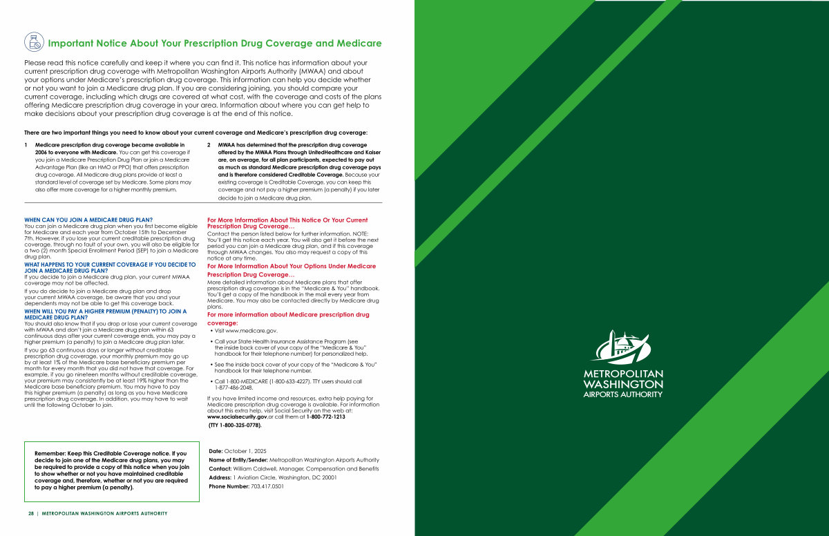 Contact the person listed below for further information. NOTE: You’ ll get this notice each year. You will also get it before the next period you can join a Medicare drug plan, and if this coverage through MWAA changes. You also may request a copy of this notice at any time.