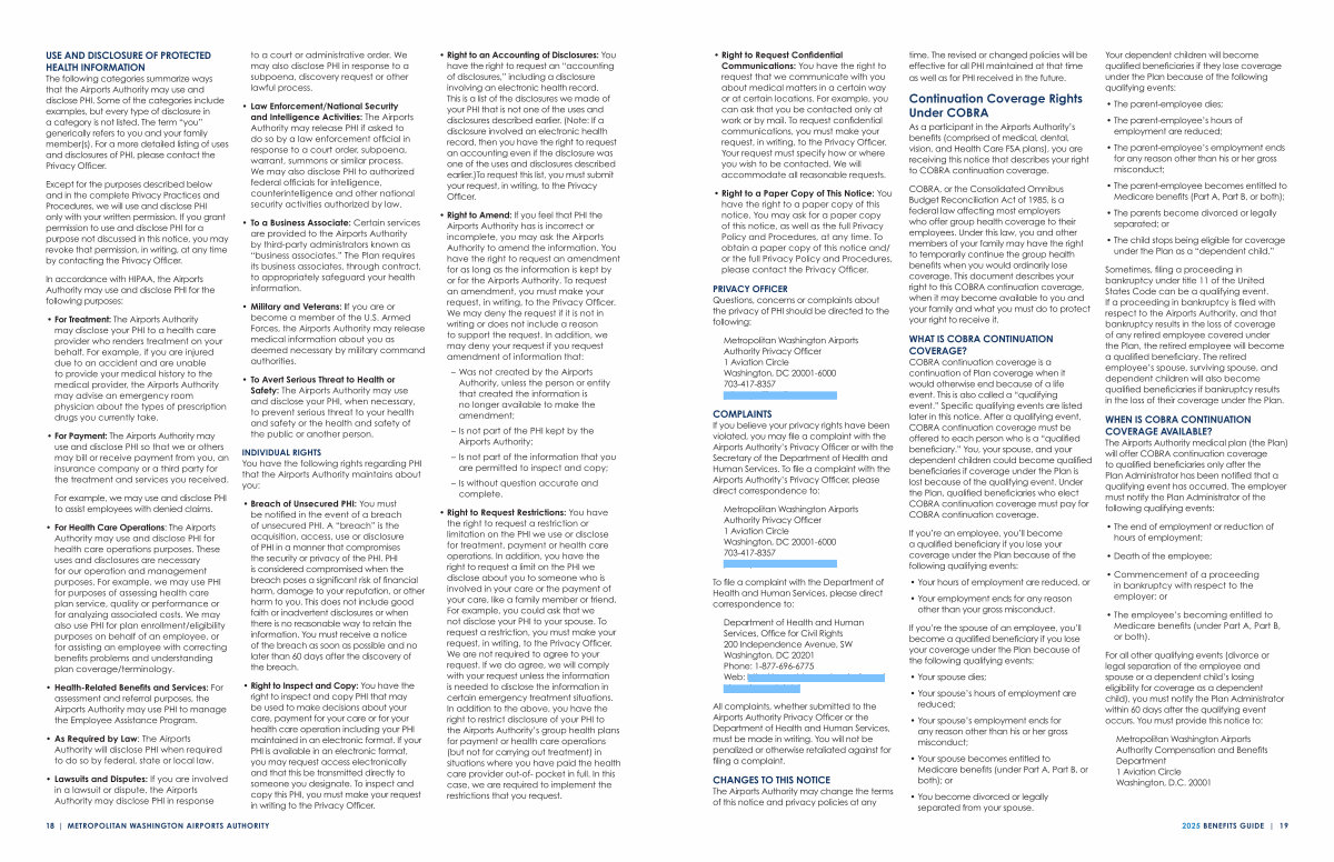 USE AND DISCLOSURE OF PROTECTED HEALTH INFORMATION The following categories summarize ways that the Airports Authority may use and disclose PHI. Some of the categories include examples, but every type of disclosure in a category is not listed. The term“ you” generically refers to you and your family member( s). For a more detailed listing of uses and disclosures of PHI, please contact the Privacy Officer.
